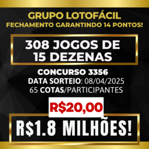 Pare de jogar na sorte e comece a jogar para ganhar! Nossos bolões da Lotofácil são criados com estratégias profissionais e análises de alto nível, aumentando drasticamente suas chances de lucro. Enquanto outros desperdiçam dinheiro, você estará investindo em jogos agressivos e certeiros, preparados para maximizar resultados. Não fique de fora: venha para o lado dos vencedores e conquiste o prêmio que você merece!